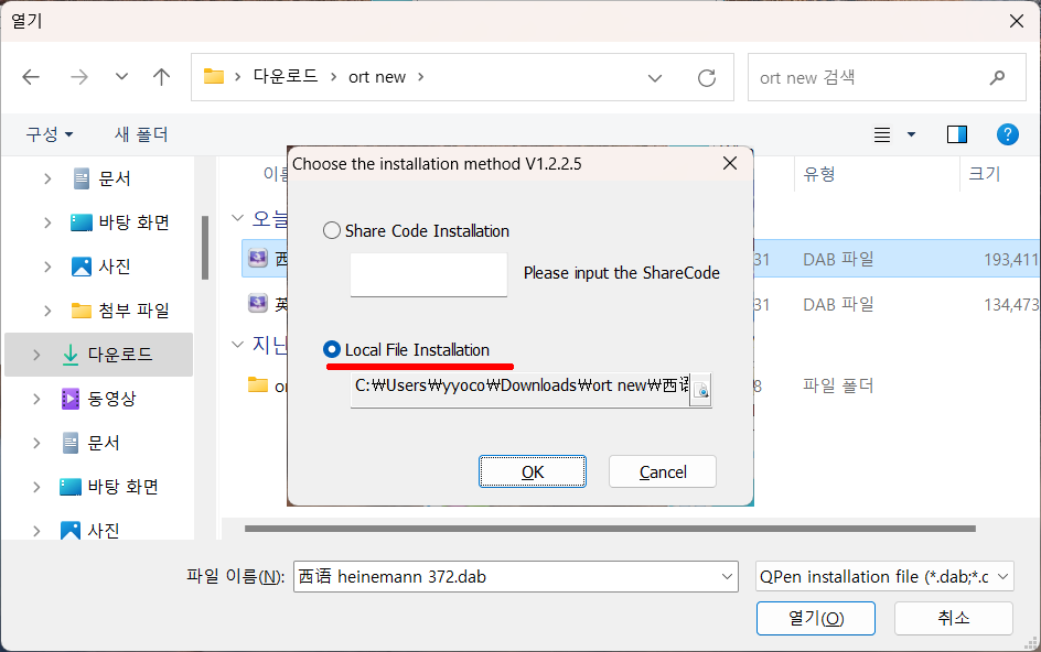 아래 Local File... 을 선택하신 후 OK 버튼 클릭